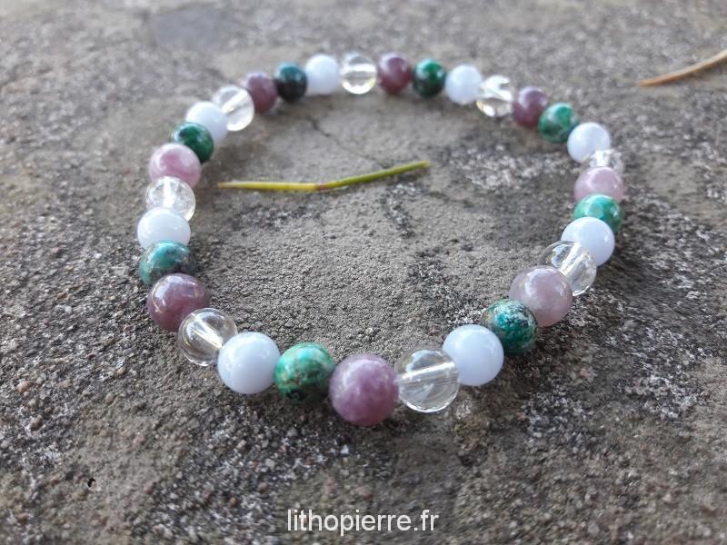 Les bracelets sont fabriqués sur mesure en perles de 6 ou 8 mm environ, rondes ou en blocs et sont montés sur un élastique de 0.8 ou 1 mm selon les pierres.